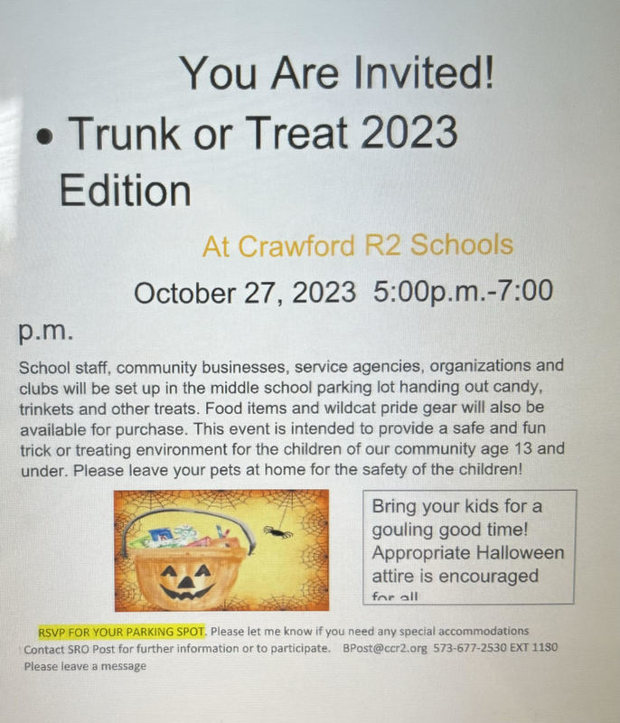 This years Trunk or Treat is coming up soon. It is scheduled for October 27th from 5 pm-7 pm. If you would like to sign up to pass out candy you can get ahold of our SRO Betty Post. Read the flyer below for more information.